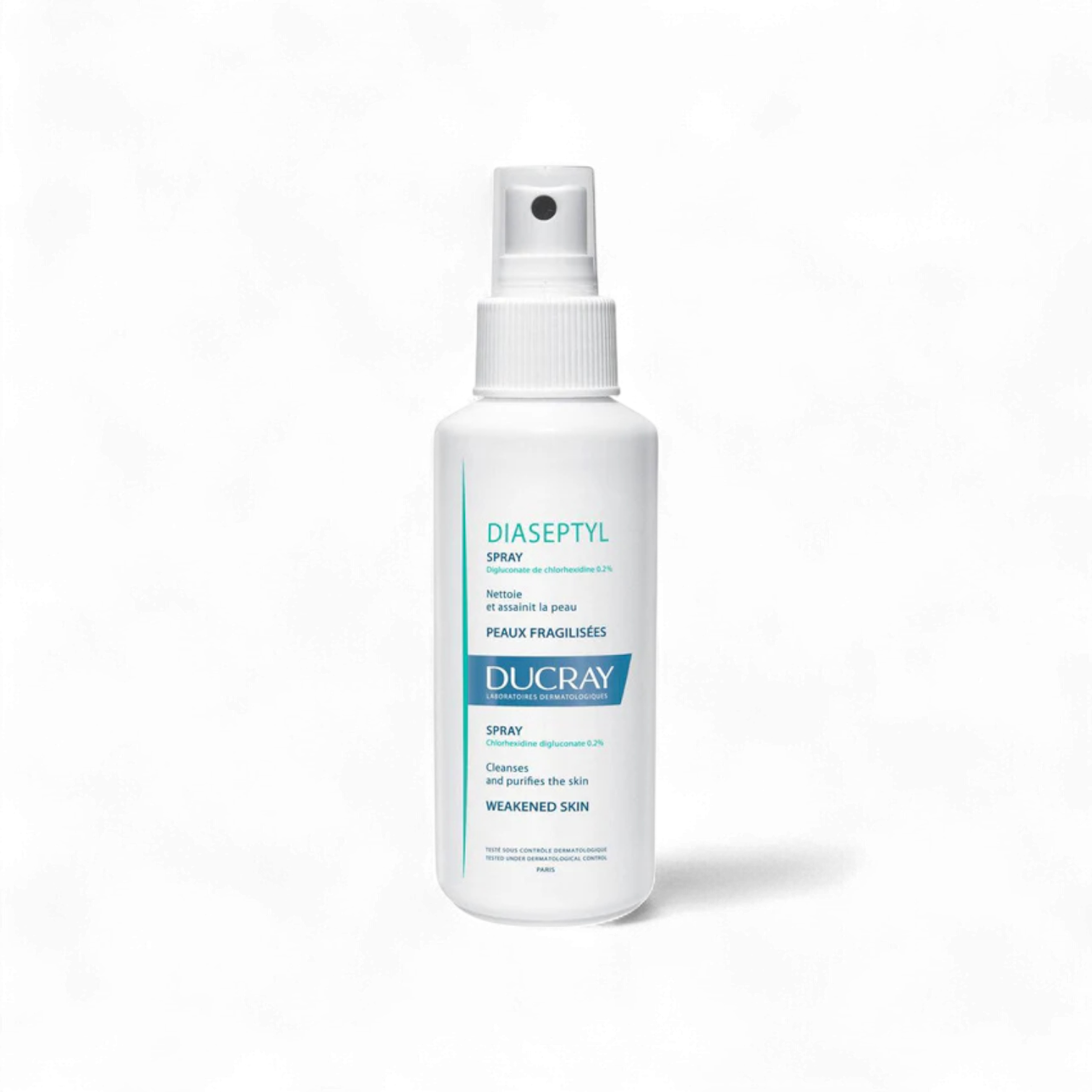 Ducray Diaseptyl Cleansing Spray is a gentle antiseptic solution formulated to cleanse and purify weakened or irritated skin. Enriched with chlorhexidine digluconate (0.2%), it effectively eliminates impurities and prevents bacterial growth without causing dryness or irritation. Ideal for minor cuts, scrapes, or post-dermatological procedures, this spray helps maintain clean and healthy skin while promoting recovery. Its practical spray format ensures easy, hygienic application without contact. Suitable for all skin types, including sensitive skin. Made in France.