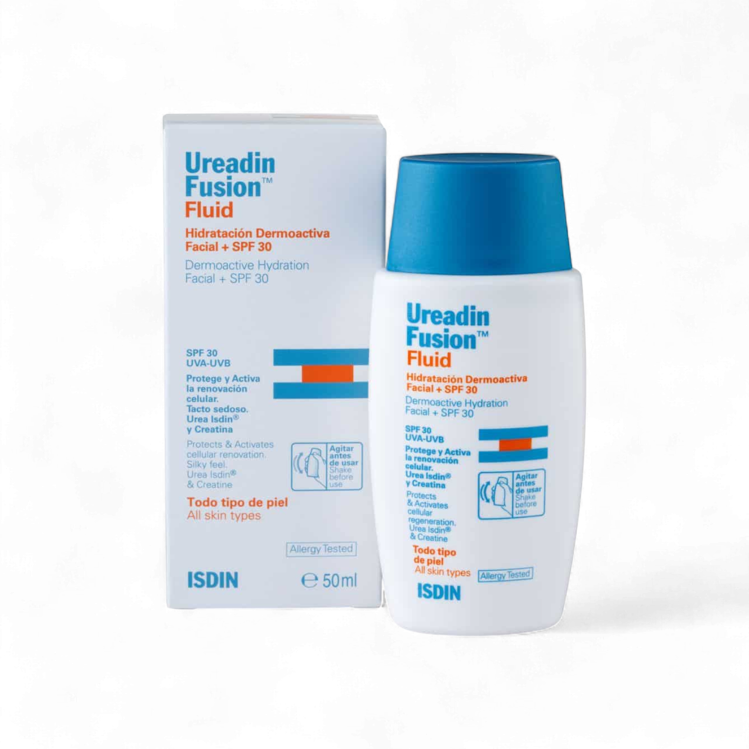 Isdin Ureadin Fusion Fluid SPF 30 is a facial sunscreen and hydrating fluid designed to protect and actively stimulate cellular regeneration. Formulated with Urea Isdin® and Creatine, it offers deep moisture while reinforcing the skin barrier and providing daily broad-spectrum UVA/UVB protection. Its light, silky texture absorbs quickly without leaving a greasy residue. Ideal for all skin types, including sensitive skin. Dermatologically and allergy tested