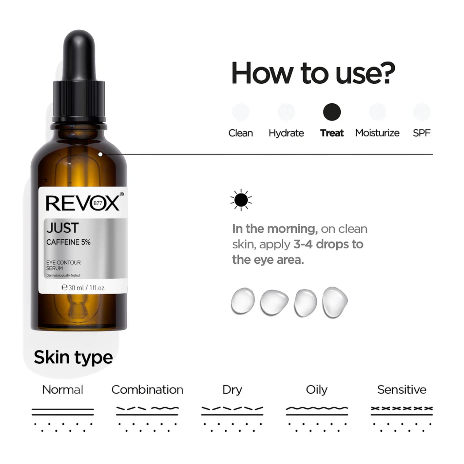 Refresh and awaken your eyes with Revox Caffeine 5% Eye Contour Serum, a concentrated formula designed to reduce puffiness, dark circles, and signs of fatigue. Enriched with caffeine and green tea extract, it delivers powerful antioxidant protection against UV and pollution-induced damage while tightening and revitalizing the delicate skin around the eyes. The lightweight texture absorbs quickly, leaving your skin smoother, brighter, and more energized. Ideal for tired or dull skin, it restores a youthful, refreshed look with every use.