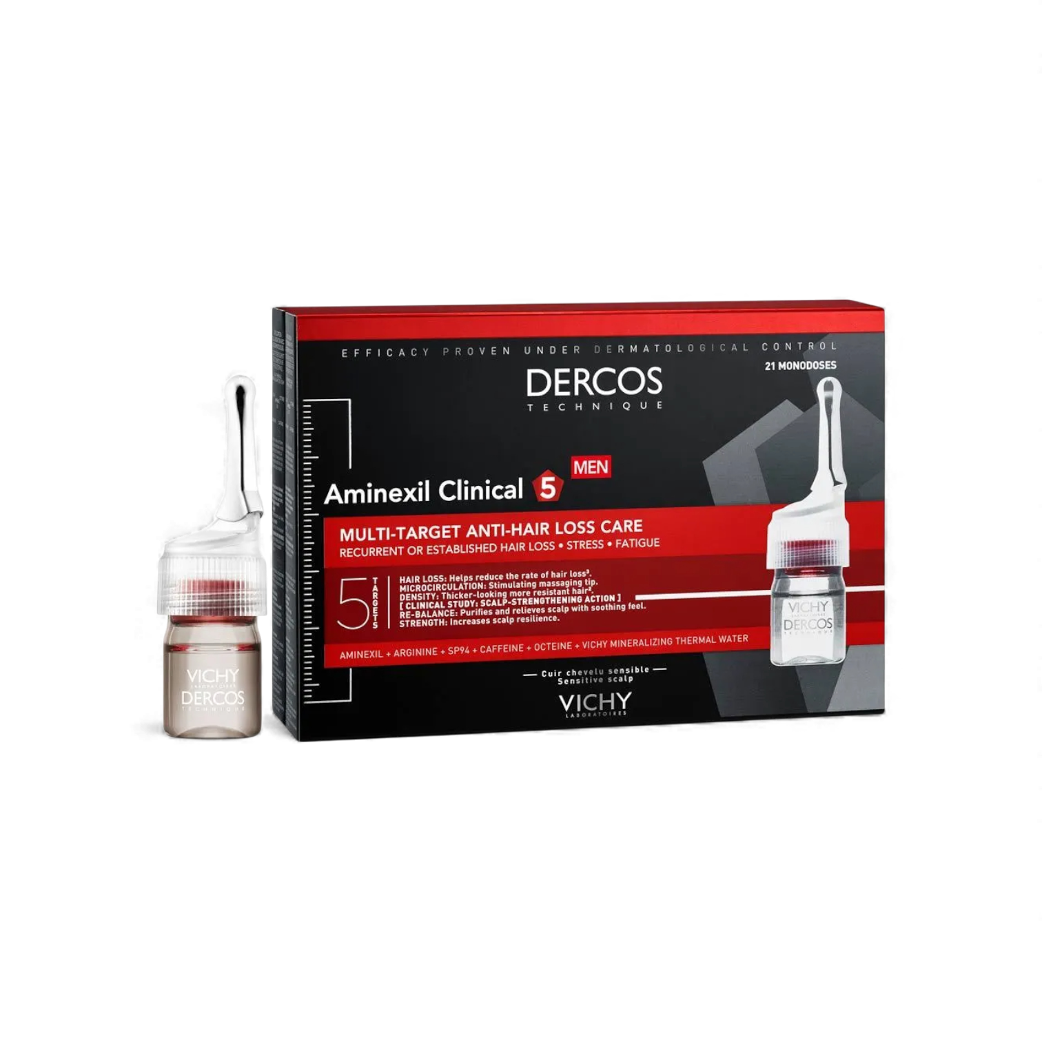 علاج فيشي ديركوس أمينيكسيل كلينيكال ٥ للرجال هو تركيبة متطورة طُوّرت بالتعاون مع أطباء الجلد لمكافحة تساقط الشعر المستمر أو الناتج عن التوتر والإجهاد. يحتوي على جزيء الأمينيكسيل الفعّال إلى جانب خمسة مكونات نشطة تمنح عناية متكاملة من الجذور حتى الأطراف. يساعد على تثبيت الشعر بقوة أكبر في فروة الرأس، ويقوّي بنيته ليصبح أكثر كثافة ومتانة مع الوقت. غني بمياه فيشي الحرارية المعدنية التي تمنح راحة للبشرة الحساسة وفعالية مضمونة عند الاستخدام اليومي