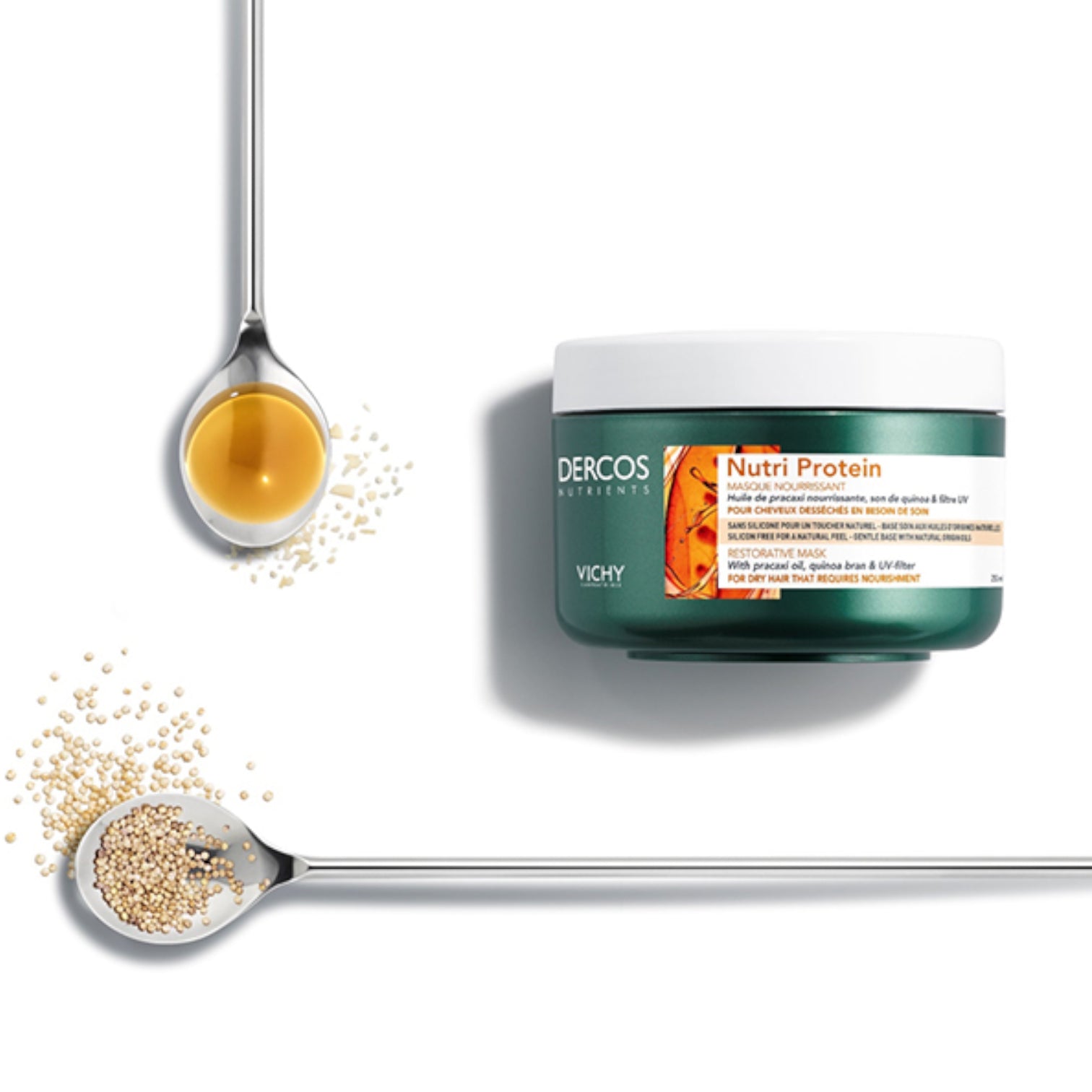 Vichy Dercos Nutrients Protein Hair Mask deeply nourishes and restores dry, damaged hair, leaving it soft, silky, and full of life. Enriched with omega-rich pracaxi oil and restorative quinoa bran, it replenishes essential nutrients lost through heat styling and UV exposure. The creamy, indulgent texture coats each strand, providing intense hydration and strength from root to tip. Infused with Vichy Mineralizing Thermal Water, it revitalizes the scalp and enhances shine while protecting against external aggressors. For optimal results, use after washing with Vichy Dercos Nutri Protein Shampoo. Suitable for dry and brittle hair.