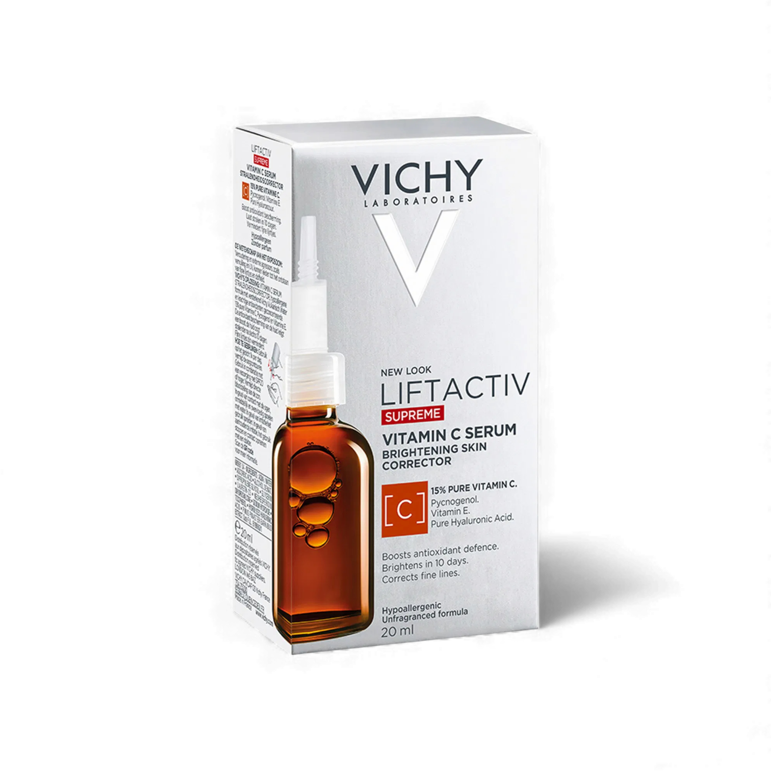 Vichy Liftactiv Vitamin C 15% Serum is a powerful dermatologist-grade treatment that boosts skin radiance and reduces visible signs of aging and fatigue. Formulated with 15% pure vitamin C, vitamin E, pine polyphenols, and hyaluronic acid, it provides antioxidant protection while brightening and evening out the complexion. Clinically proven to deliver visible results in just 10 days, it helps defend the skin from pollution-induced discoloration and restores a healthy, luminous glow. Fragrance-free, paraben-free, and colorant-free, this lightweight serum absorbs quickly and leaves the skin smoother, firmer, and revitalized.